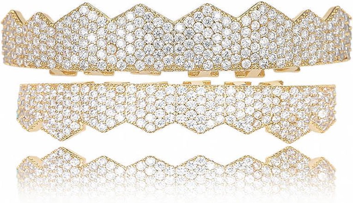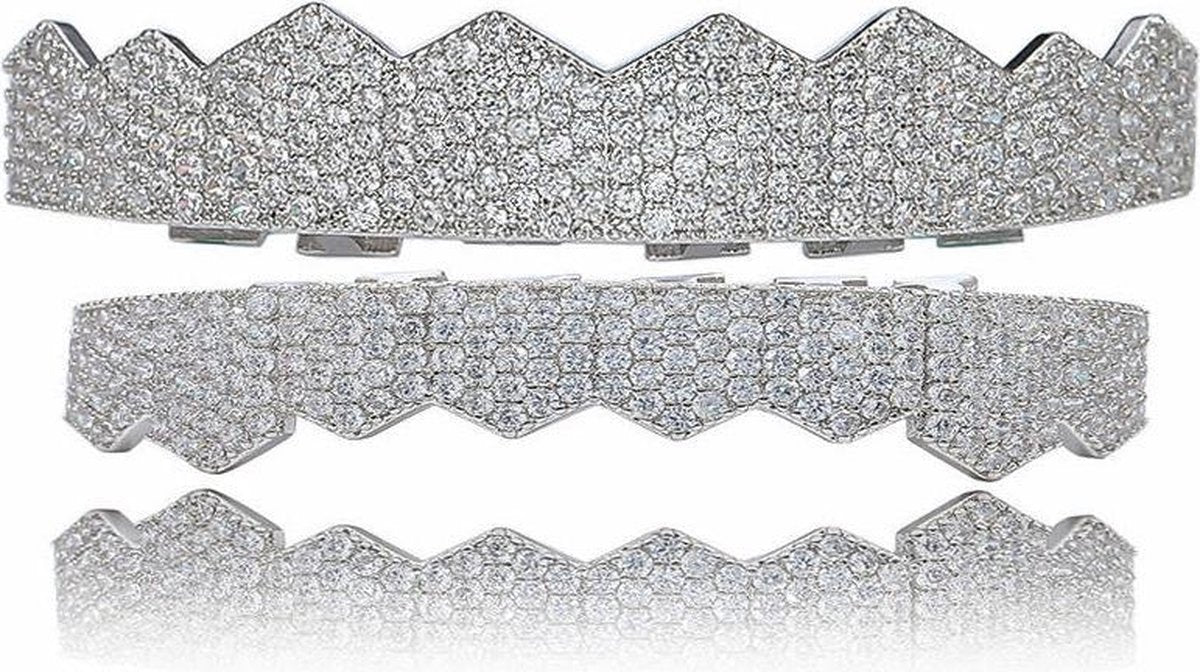 Een set van goud of zilver kleurige grillz, volledig belegd met Zirkonia stenen. De set bestaat uit twee delen om zowel over de boven- als ondertanden te plaatsen.