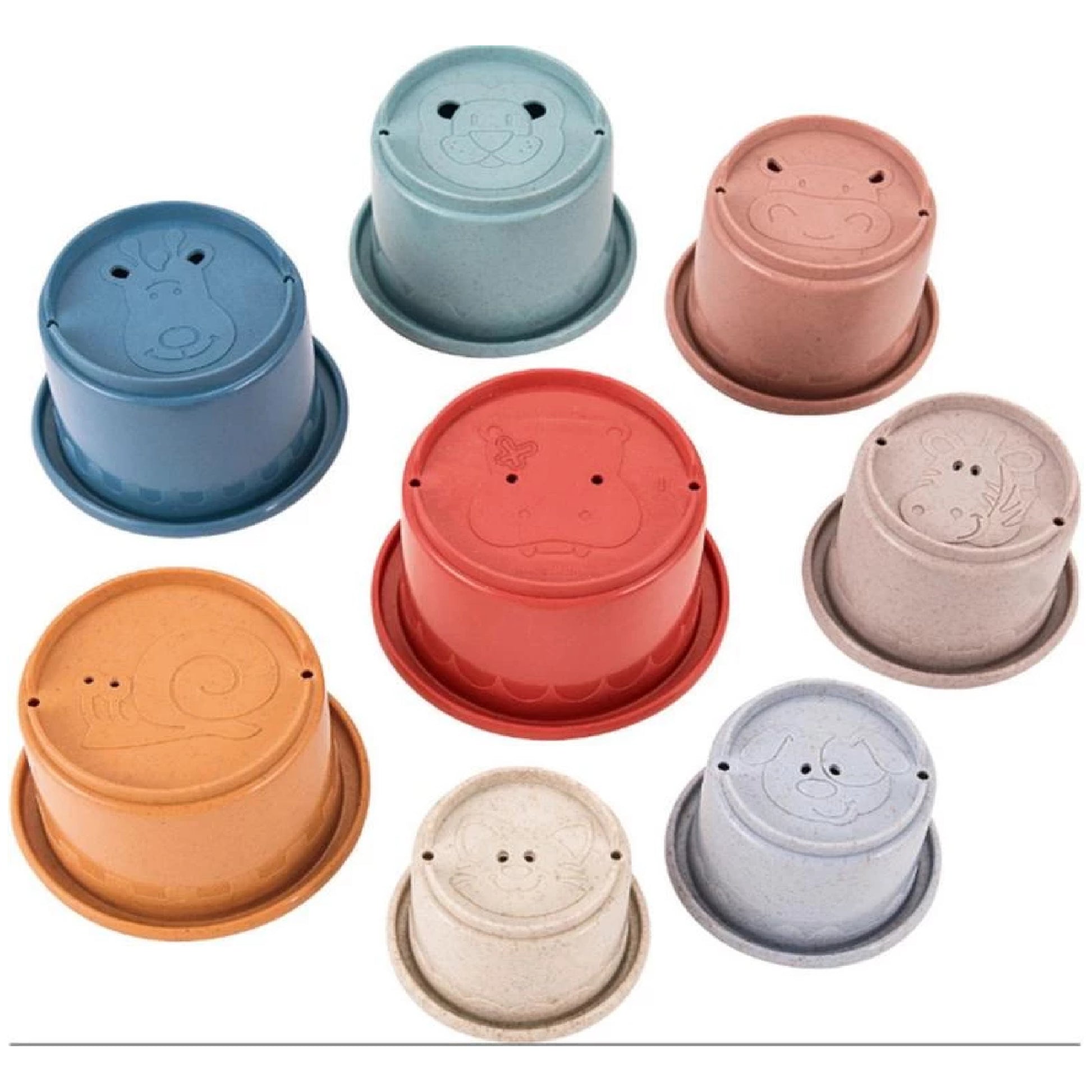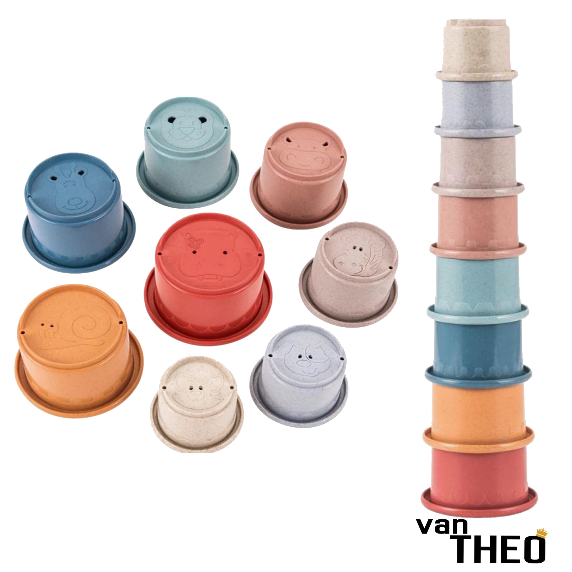 van Theo® Stapeltoren - Stapelbekers - Baby Speelgoed vanaf 0 jaar - Zand Strand Bad Box - Stacking Cups - 8 Kleuren en Dieren - Pastel