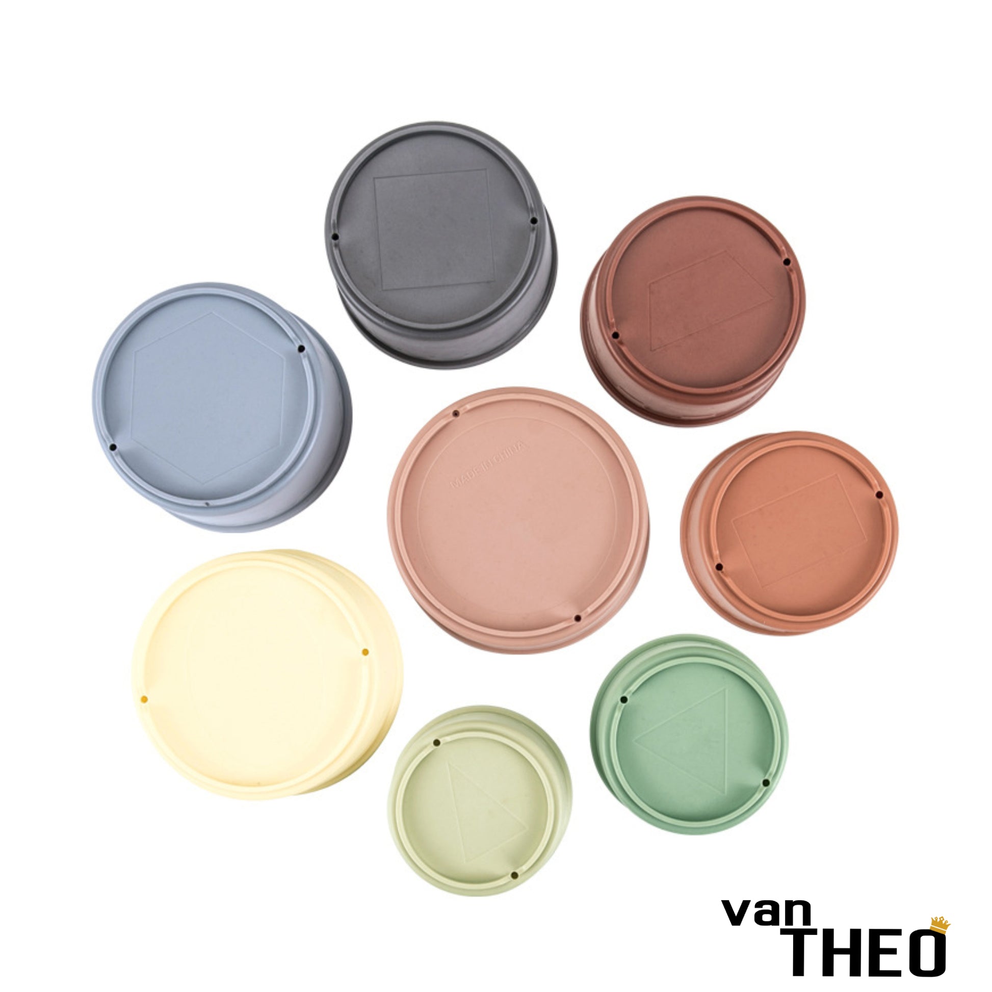 van Theo® Stapeltoren - Stapelbekers - Baby Speelgoed vanaf 0 jaar - Zand Strand Bad Box - Stacking Cups - 8 Kleuren en Vormen - Pastel